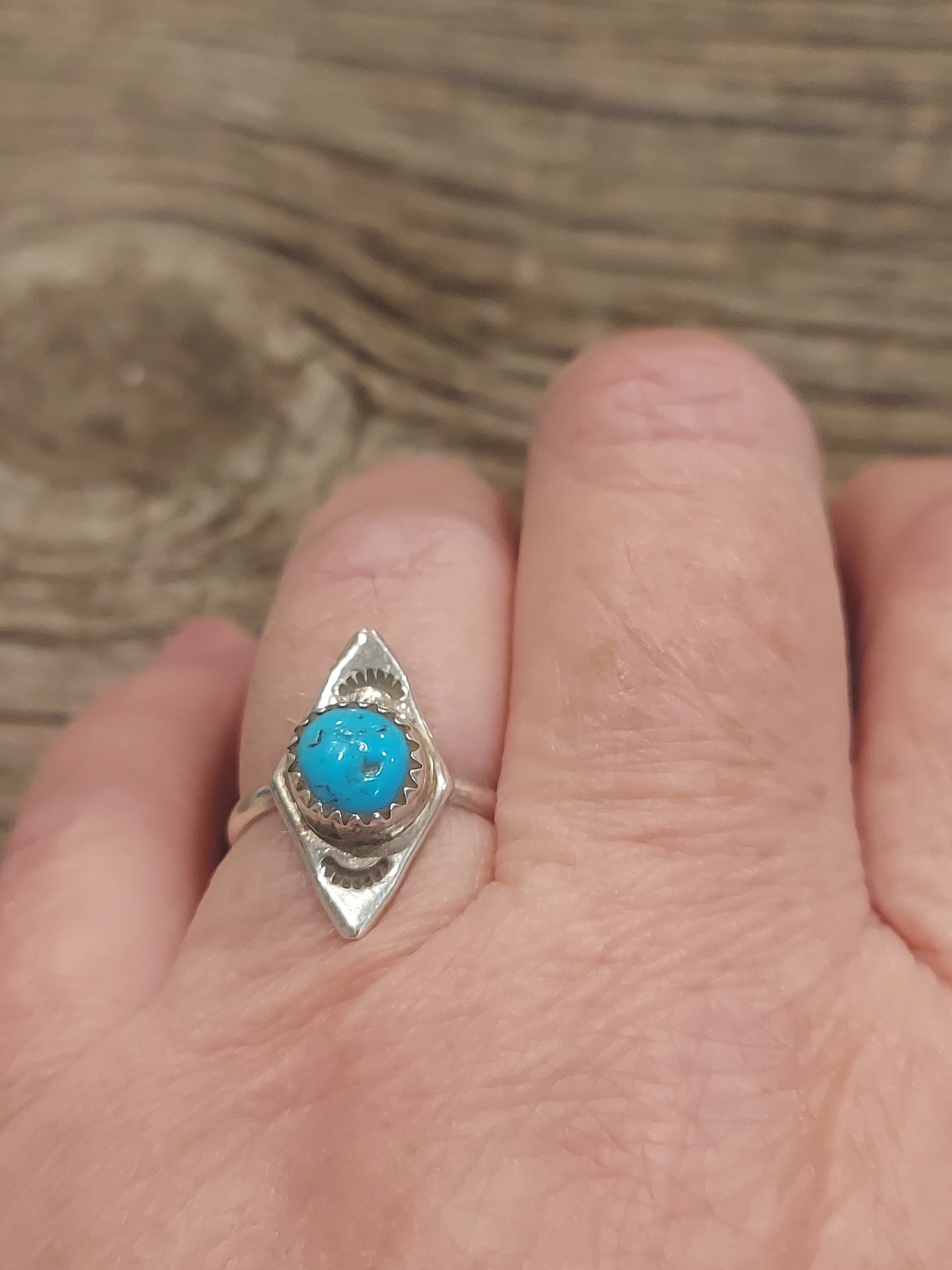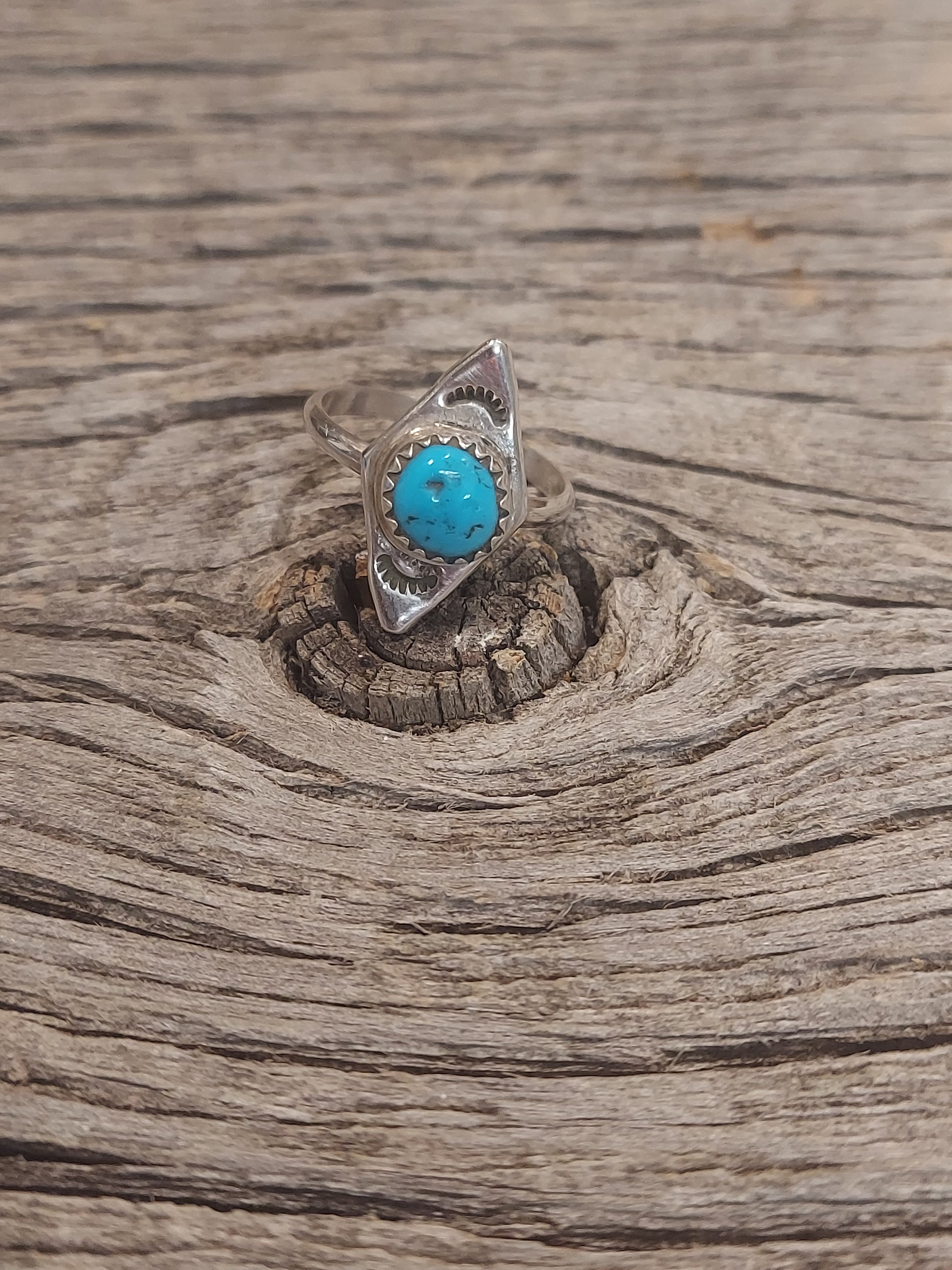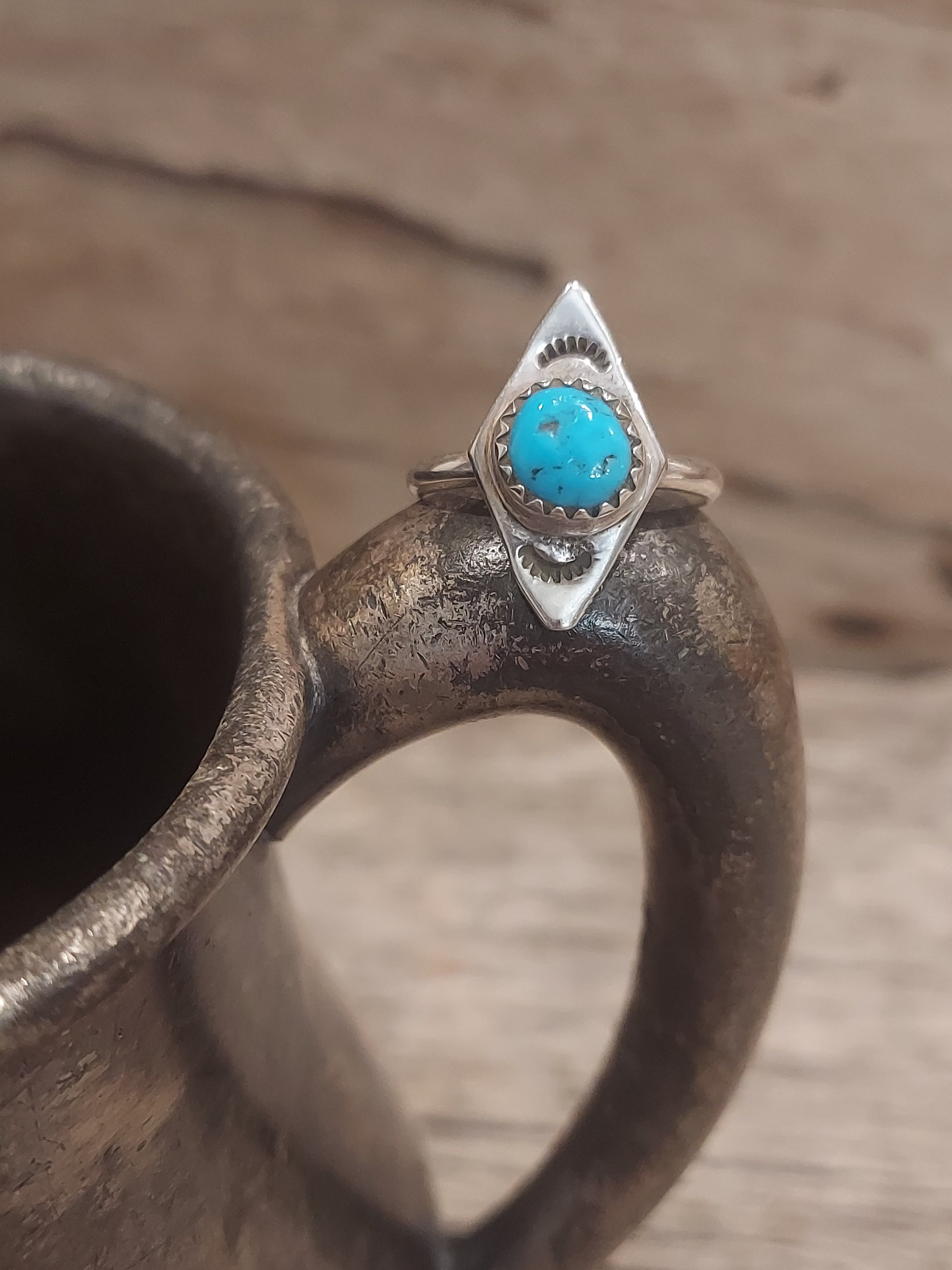 Stamped Sterling Silver Diamond Shaped Ring with Round Turquoise Stone