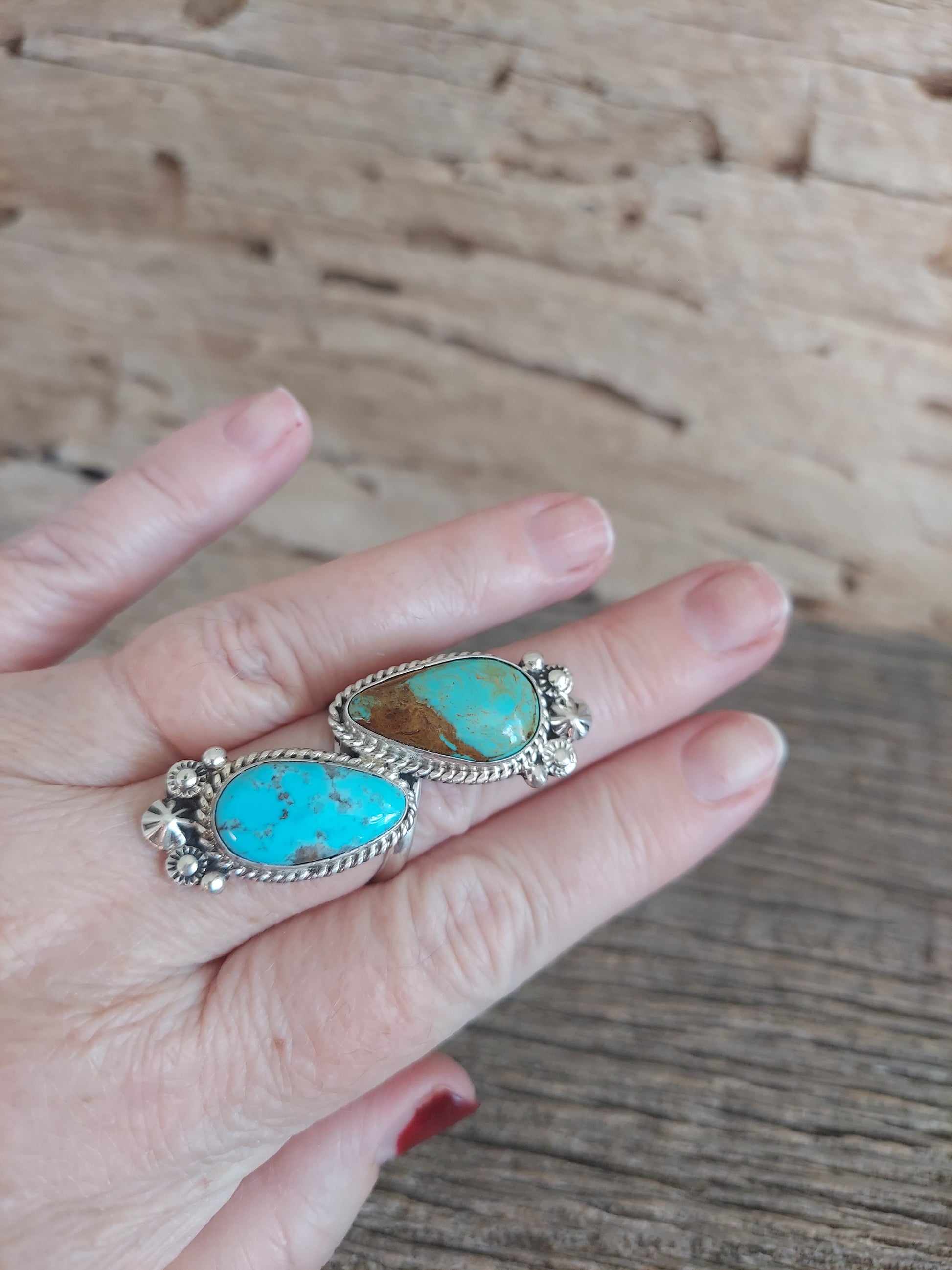 Sterling Silver Large 2 Stone Blue and Green Turquoise Ring Hallmarked and Stamped