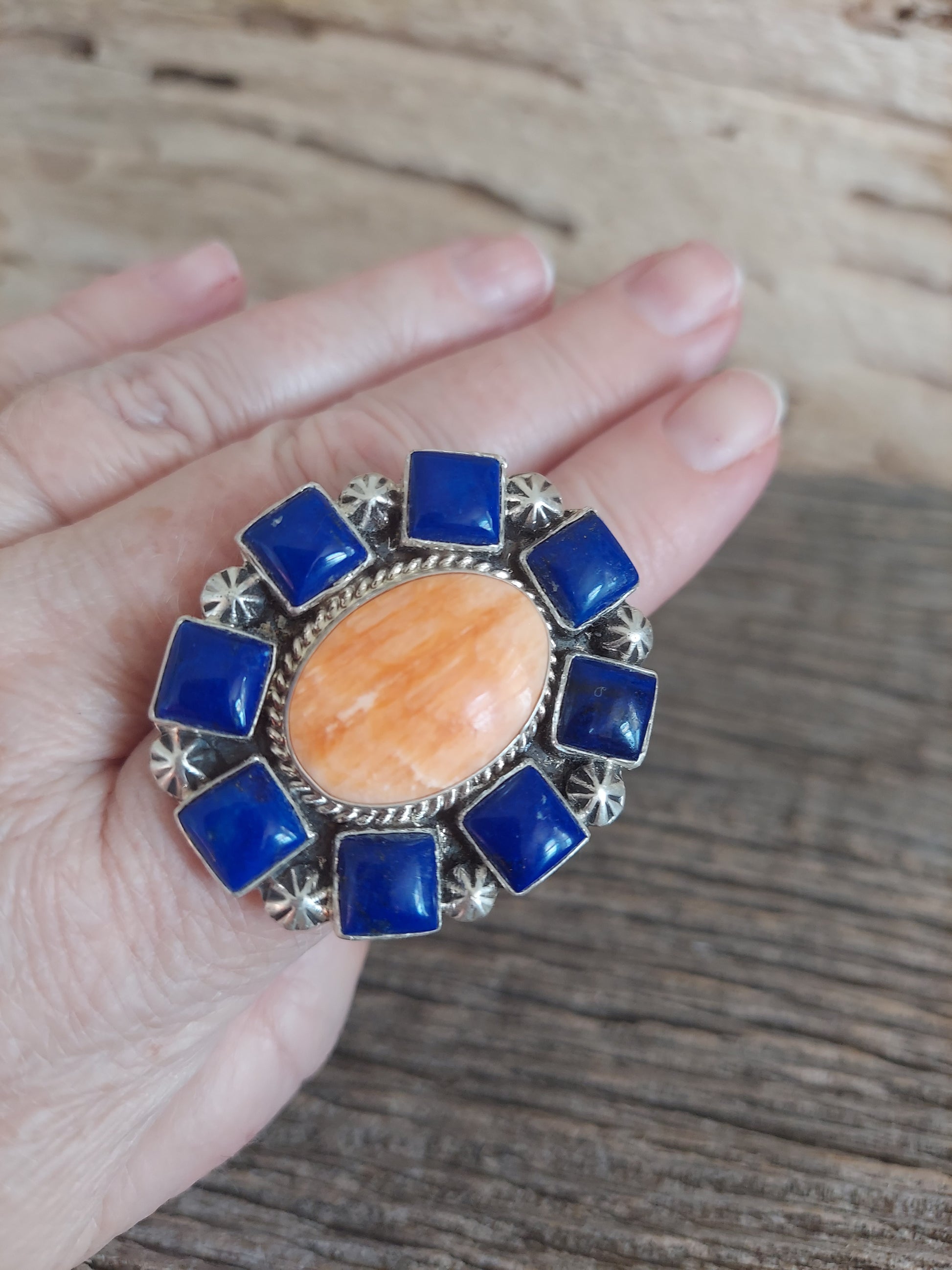 Sterling Silver Lapis and Spiny Oyster Ring Signed and Stamped.