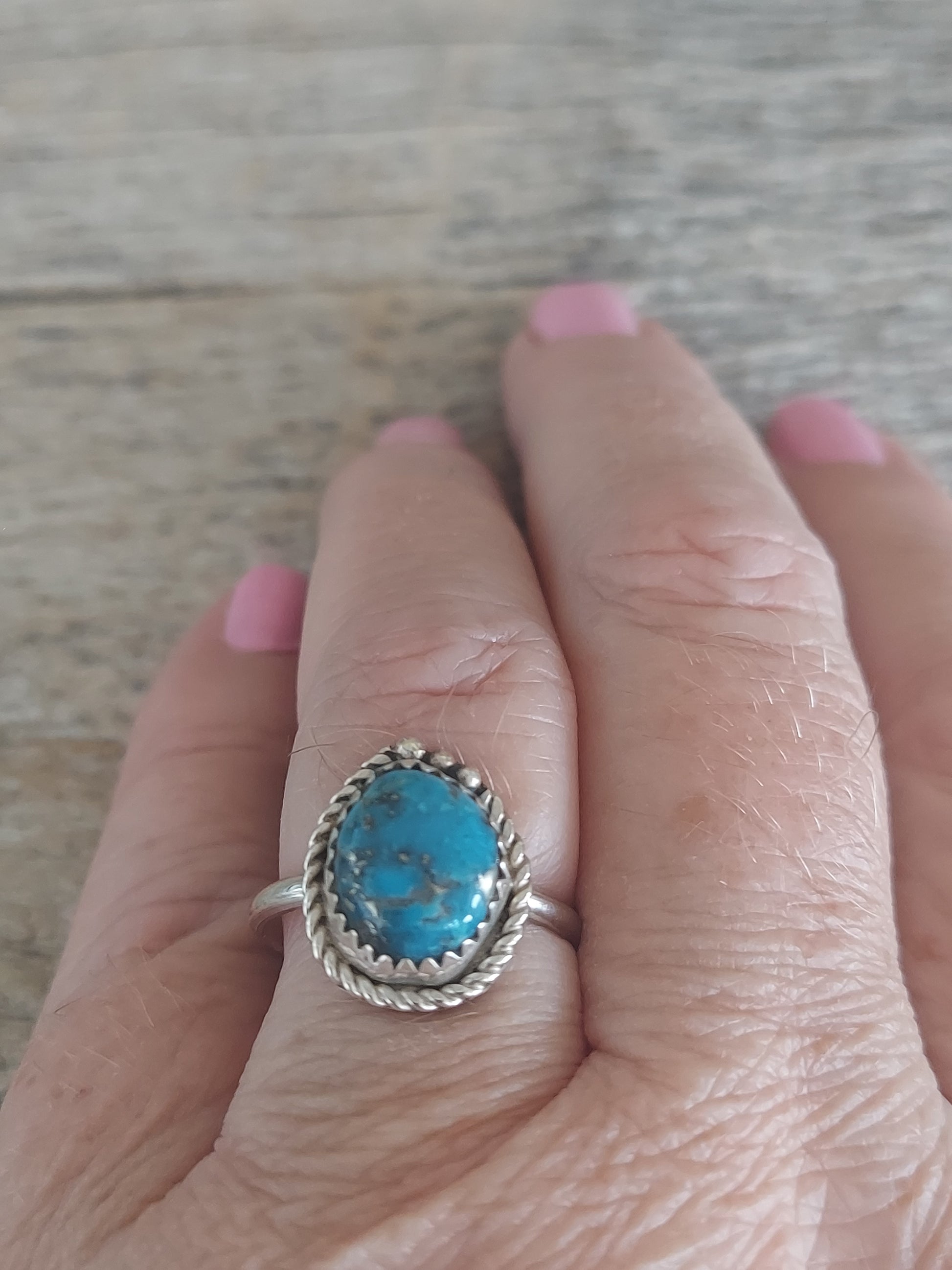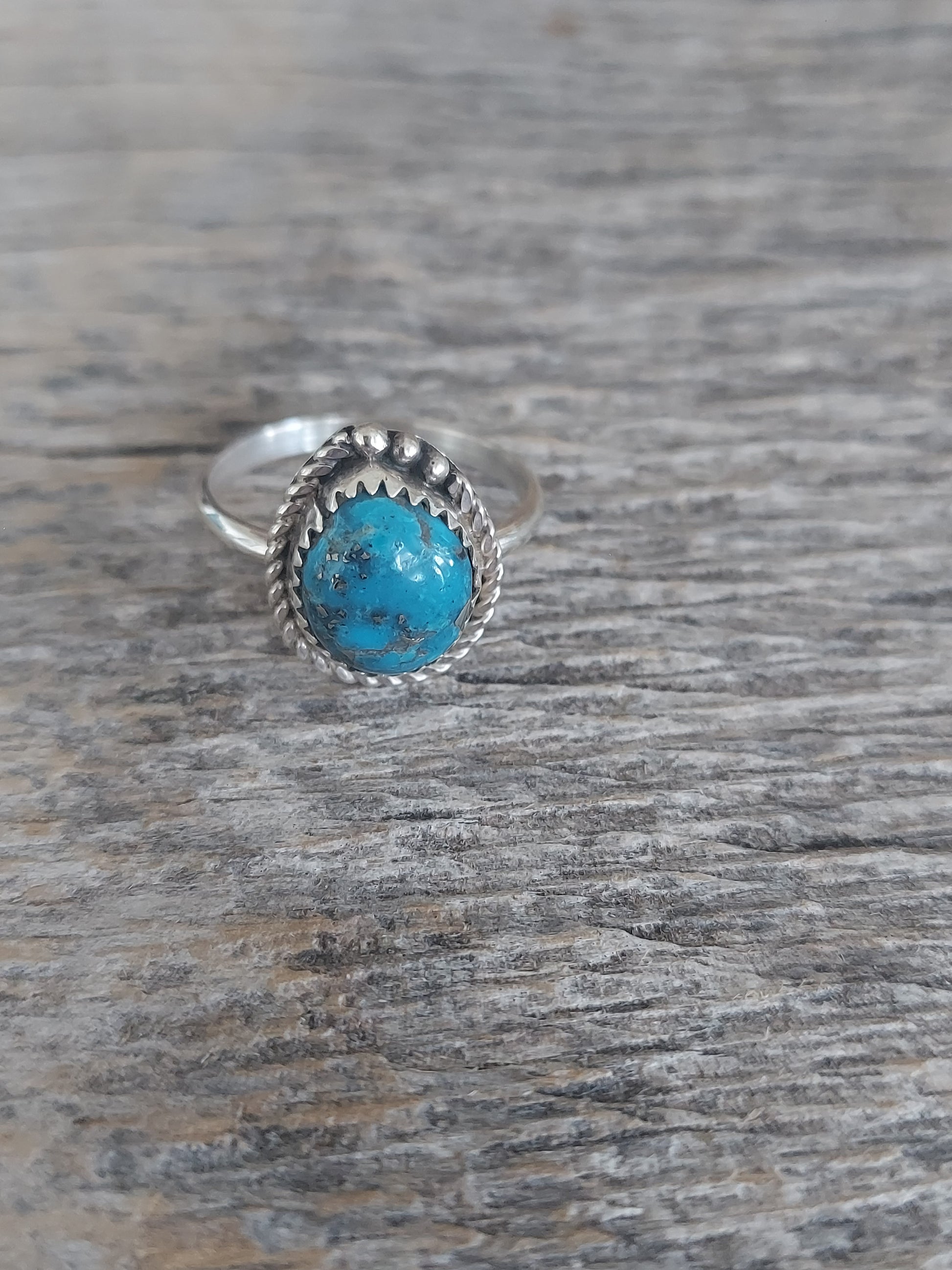 Sterling Silver Dark Turquoise ring with with rope around edge and 3 small silver circles on edge stamped